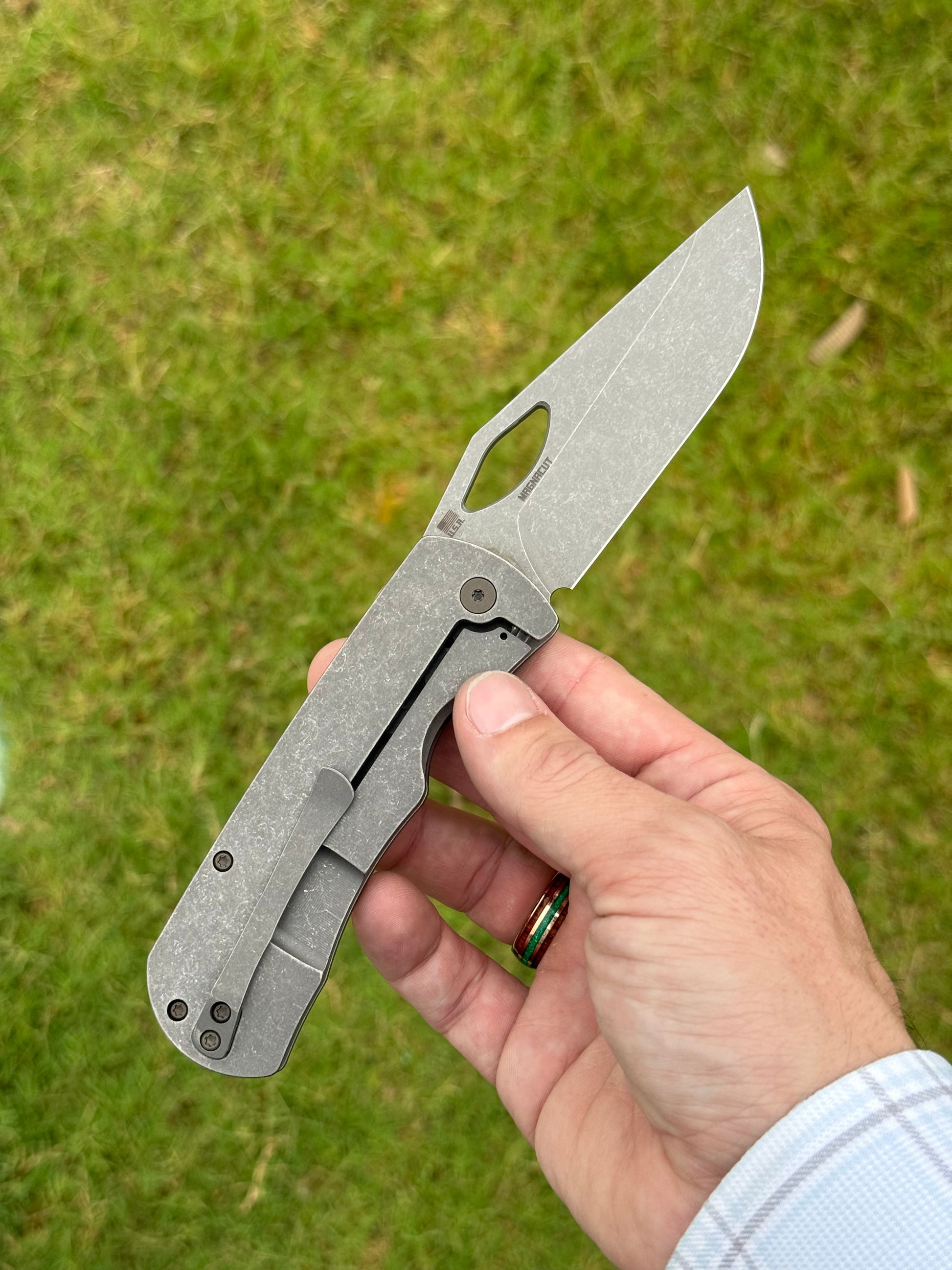 - Hollow-Ground MagnaCut Blade – 3.75″ of full-width hollow grind (63–64 HRC) for laser-sharp slicing, chamfered to the tip for precision .