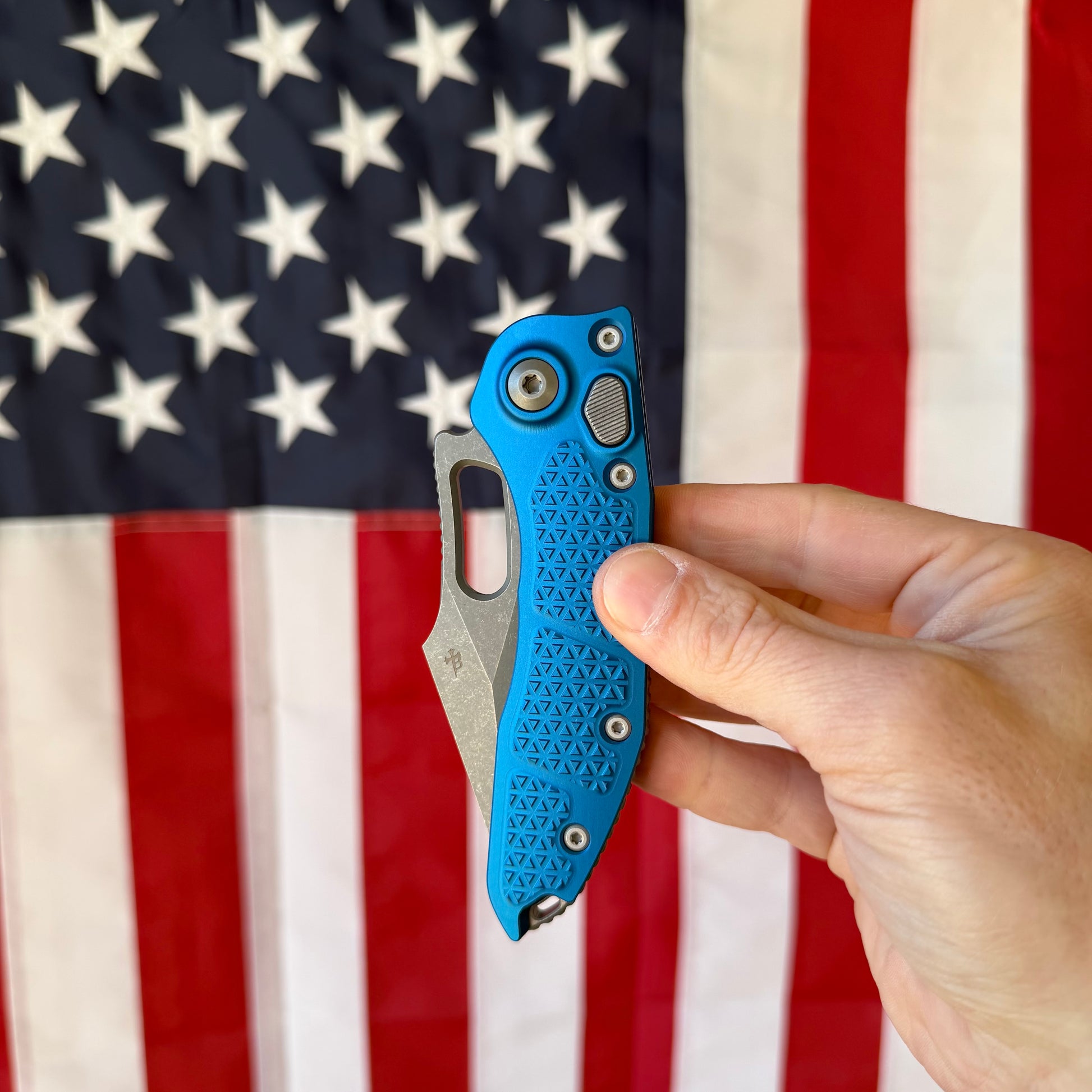 The blue anodizing on this Stitch is smooth, consistent, and gives the knife a premium feel. Combined with the apocalyptic blade finish, it balances toughness with style. It is one of the cleanest Stitch configurations Microtech has put out.